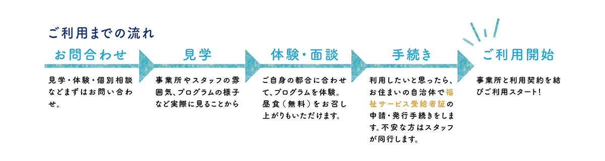 事業所と利用契約を結びます。あなたにあった利用計画を相談しながら1つずつ決めていきます。
